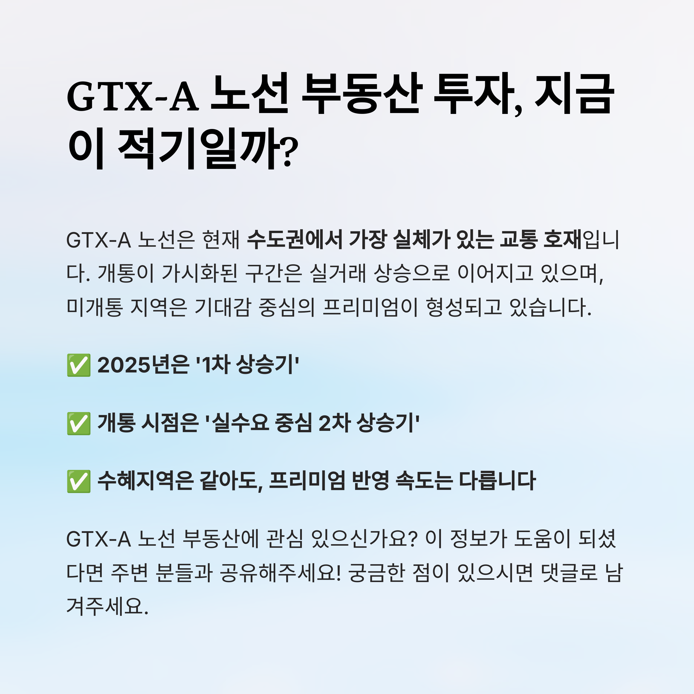 🚄 GTX-A 노선 개통을 앞둔 2025년, 동탄~삼성~청량리 라인 부동산은 어떻게 움직일까? 실거래 상승세가 시작된 지금, 수혜지역별 특징과 가격 흐름, 향후 프리미엄 전망까지 한눈에 정리해드립니다.